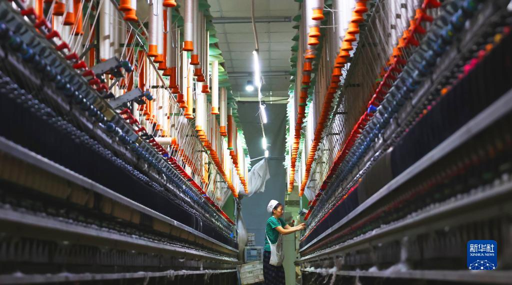 7月17日,在江蘇省連雲港市海州區一家紡織企業,工人在生産線上忙碌。