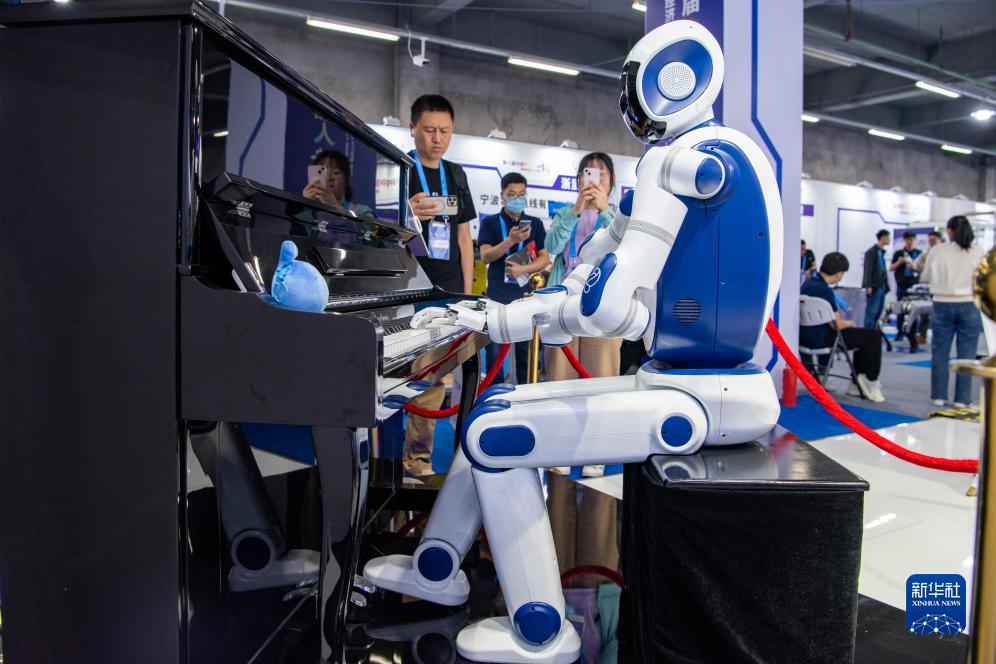 客商在浙江省余姚市舉辦的第八屆中國機器人峰會上欣賞機器人彈鋼琴(5月24日攝)。