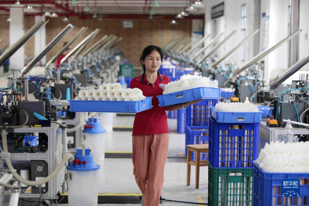 在貴州省錦屏經濟開發區一家體育用品公司羽毛球生産基地,工人搬運羽毛球(6月15日攝)。