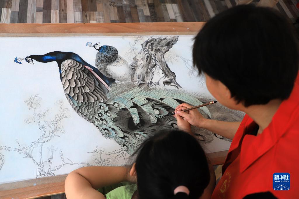 7月17日,在河北省滄州市孟村回族自治縣新時代文明實踐中心,志願者教小朋友畫工筆畫。