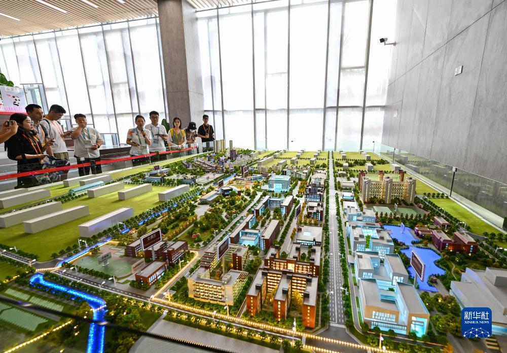 7月15日,媒體記者在大運村歡迎中心觀看園區沙盤。