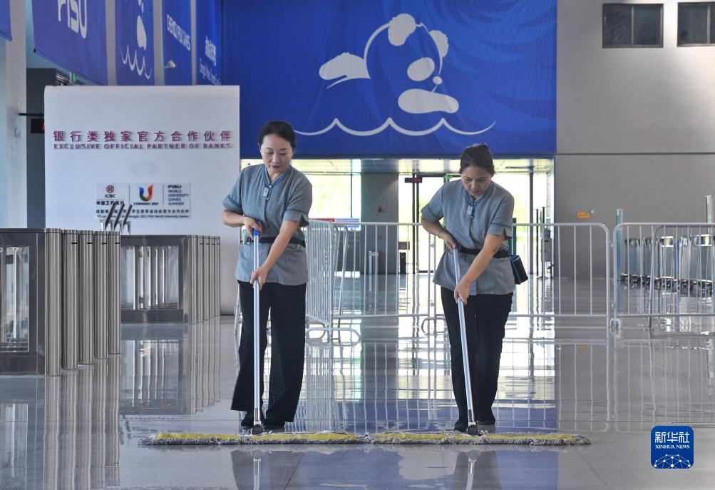 7月16日,華潤置地物業保潔人員在游泳跳水館打掃地面衞生。