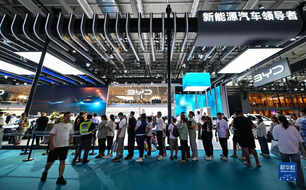 7月17日,觀眾在長春汽博會比亞迪品牌汽車展區前排隊等待入場。