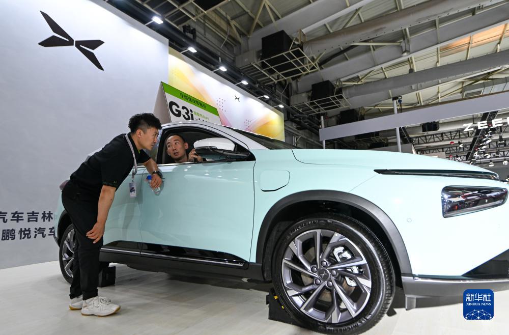 7月17日,一名參觀者在長春汽博會小鵬汽車品牌展區體驗一款汽車。
