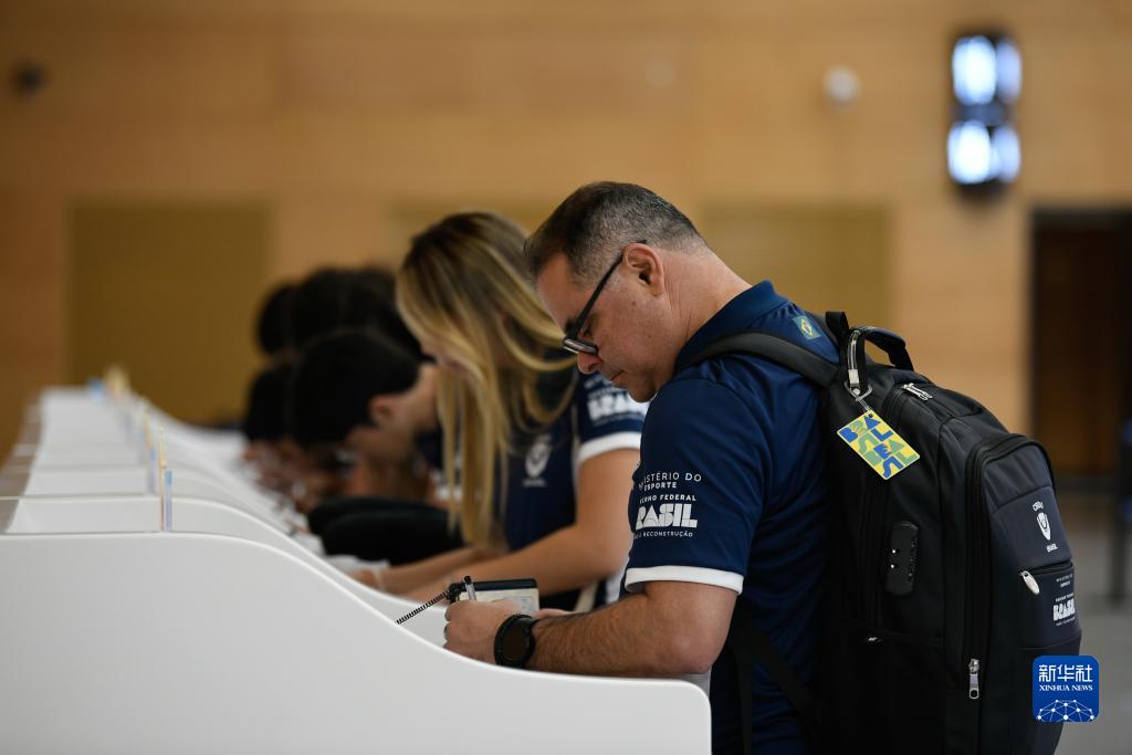 7月17日,在成都天府國際機場,首批抵蓉的巴西代表團成員填寫入境卡。