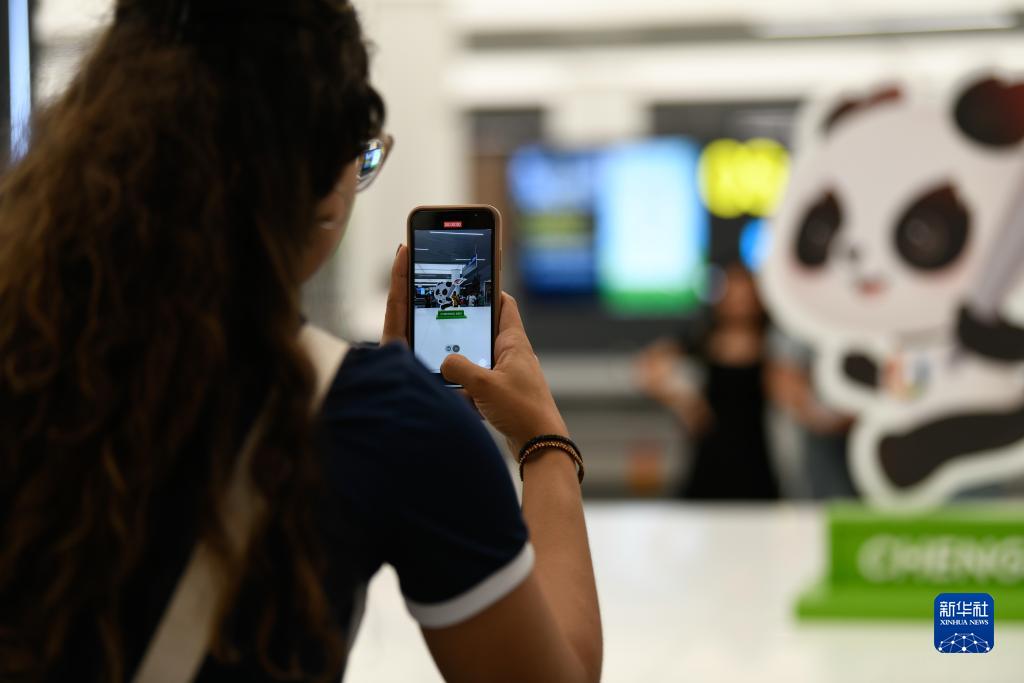 7月17日,在成都天府國際機場,巴西代表團成員在等候行李時拍攝機場內的大運會吉祥物“蓉寶”裝飾。