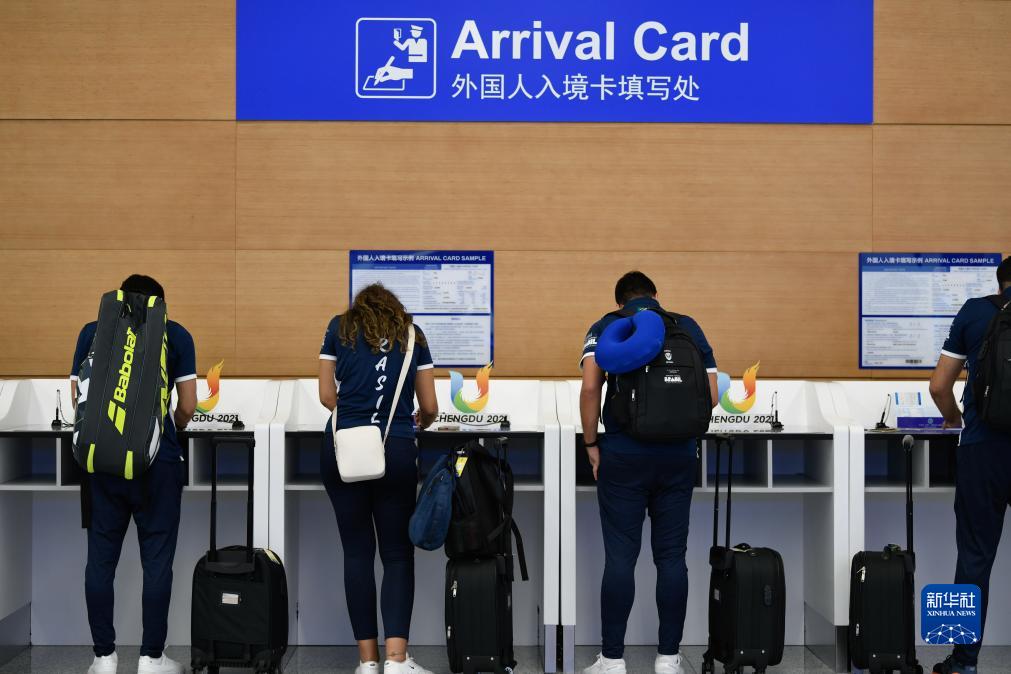 7月17日,在成都天府國際機場,抵蓉的巴西代表團成員填寫入境卡。