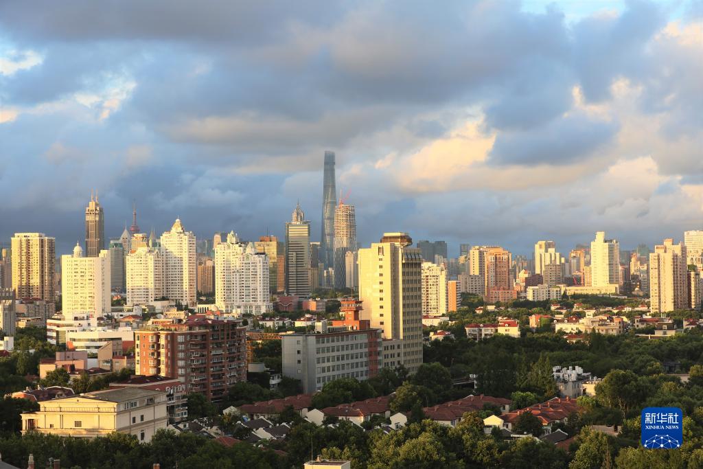 黃昏時分,上海天空中的雲朵被夕陽染成金黃色,蔚為壯觀。