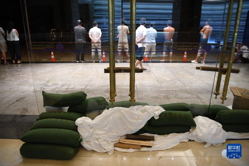 7月17日晚,在廣東湛江海濱大道北一處酒店,門口堆放着防汛沙袋。