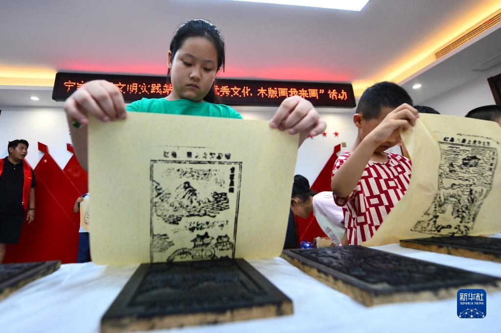 7月17日,在山東省青島市城陽區紅島街道寧家社區公益課堂,學生們體驗製作木版年畫“紅島八景”。