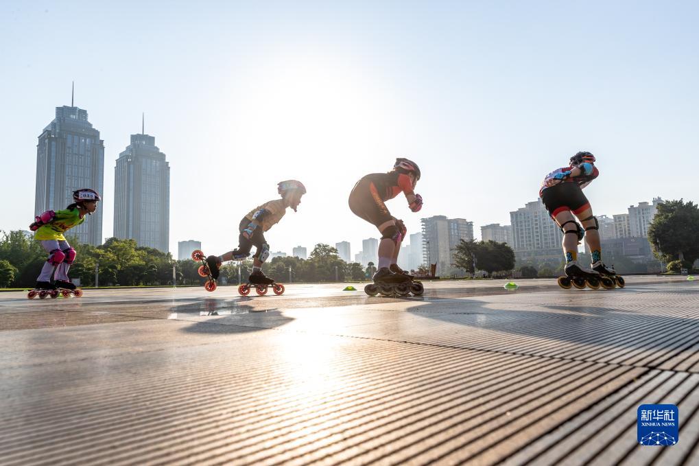 7月17日,孩子們在重慶市南川區市民廣場練習輪滑。