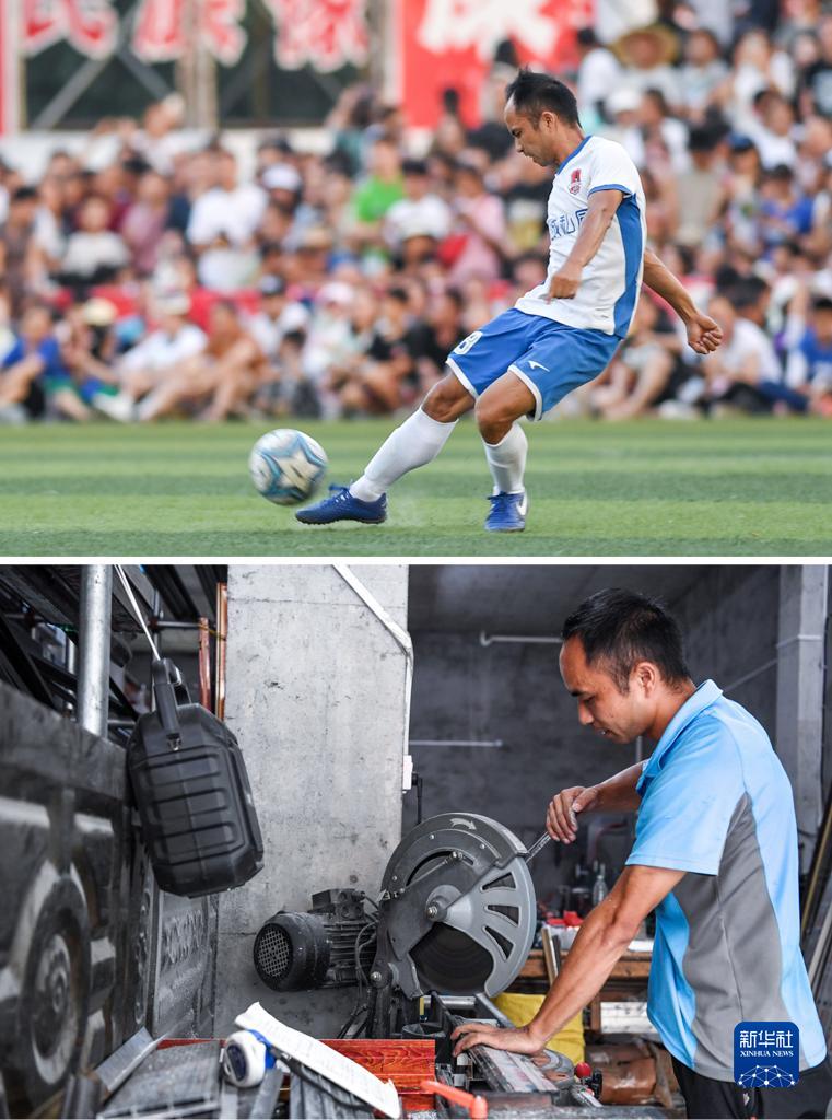 拼版照片:上圖為7月15日,豐樂村一隊球員朱永輝在賽場上開球;下圖為7月14日,朱永輝在建材裝修門店里加工建材。朱永輝是一名裝修建材加工工人,在球隊裏任中後衛。