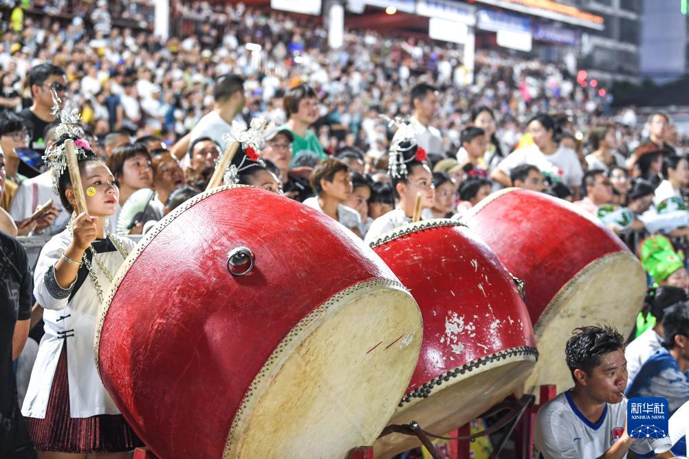 7月15日,拉拉隊在貴州“村超”足球賽場邊擊鼓助威。