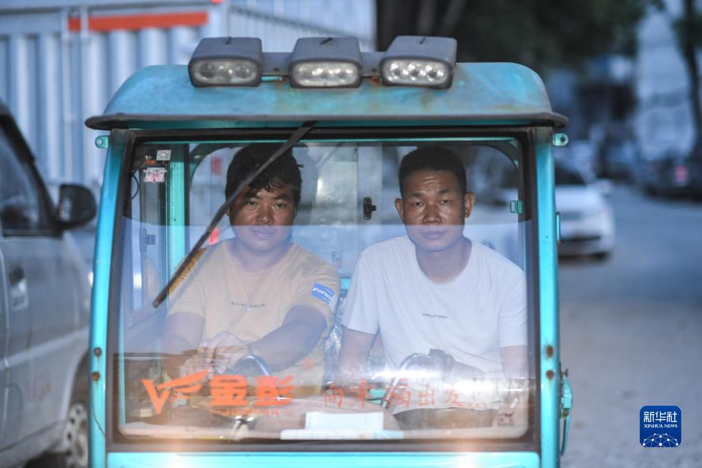 7月15日,豐樂村一隊球員賈勇輝(右)與朋友駕駛三輪車在給客戶送豆芽途中。