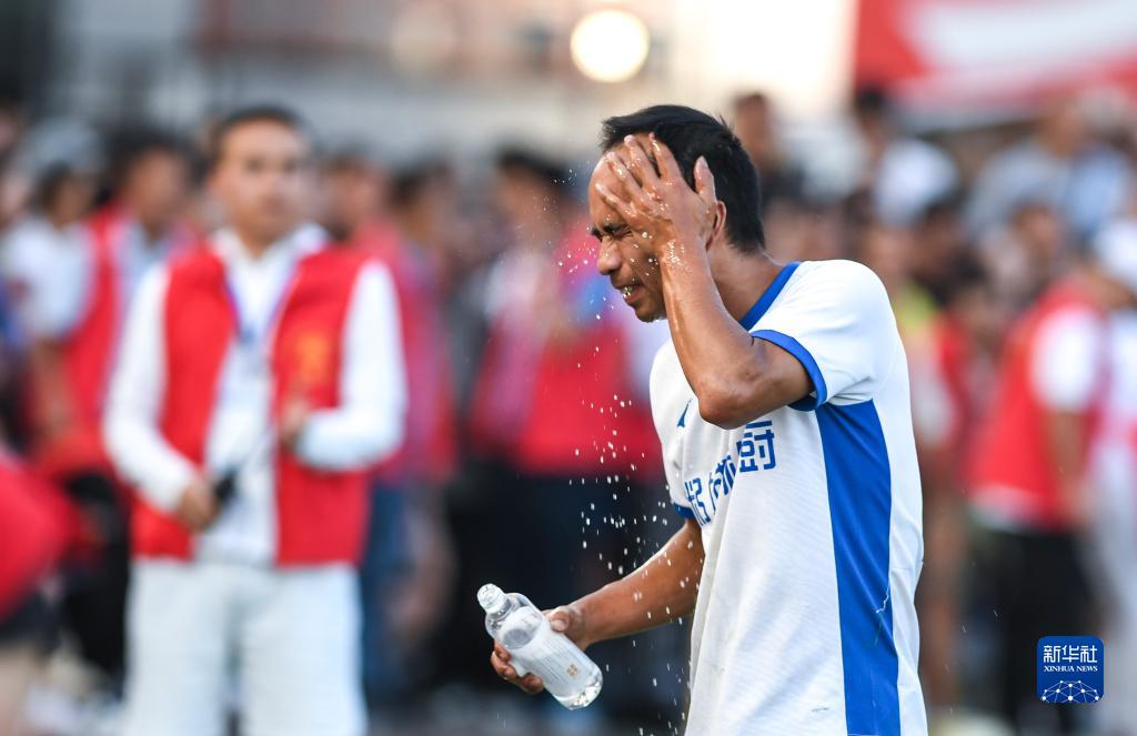 7月15日,豐樂村一隊球員朱永輝在“村超”賽場上補水降溫。