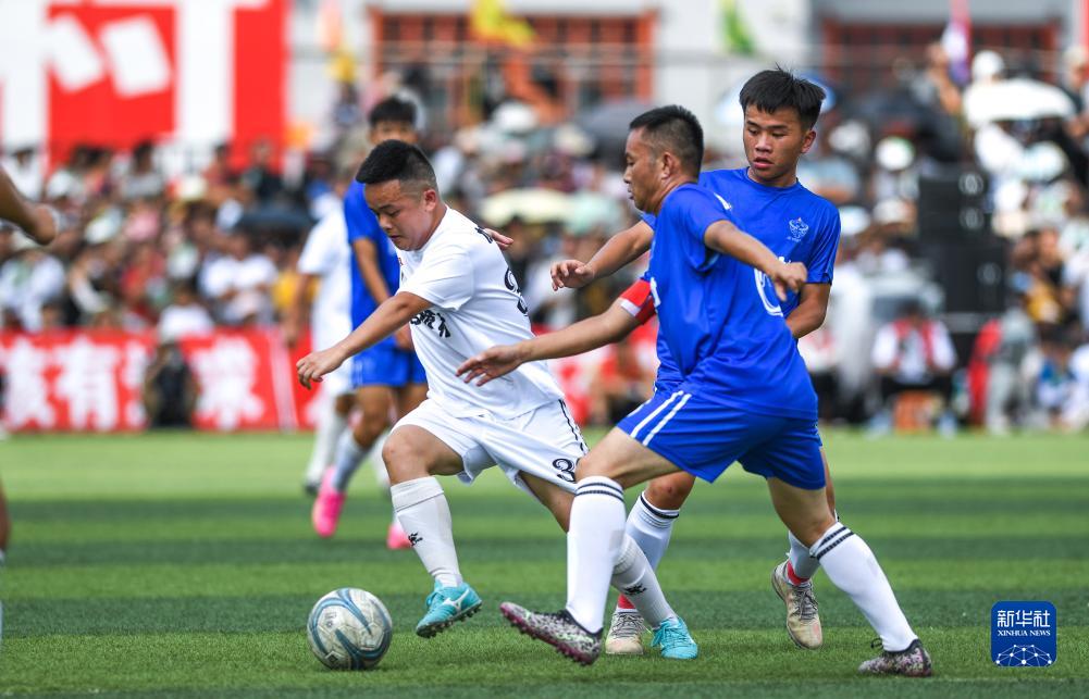 7月15日,六佰塘村足球隊球員楊宗維(左一)在與月寨村足球隊的比賽中拼搶。