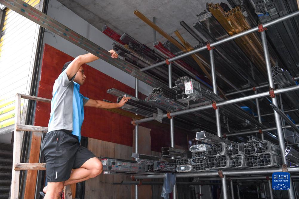 7月14日,豐樂村一隊球員朱永輝在建材裝修門店裏挑選建材。
