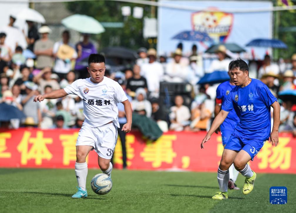 7月15日,六佰塘村足球隊球員楊宗維(左)在與月寨村足球隊的比賽中帶球進攻。