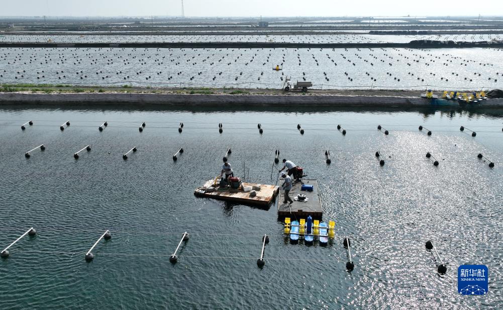 7月17日,河北省樂亭縣姜各莊鎮第二節村村民在海産品養殖基地的海參養殖池安裝增氧設備(無人機照片)。