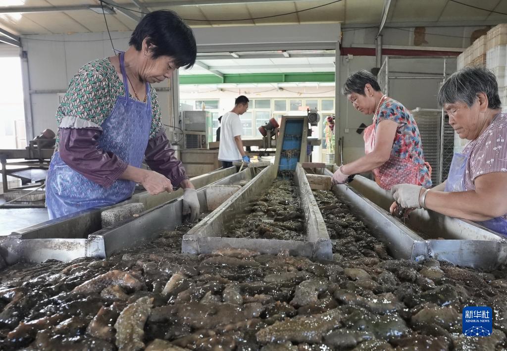 7月17日,河北省樂亭縣姜各莊鎮前營村一海參養殖合作社社員在清洗加工海參。
