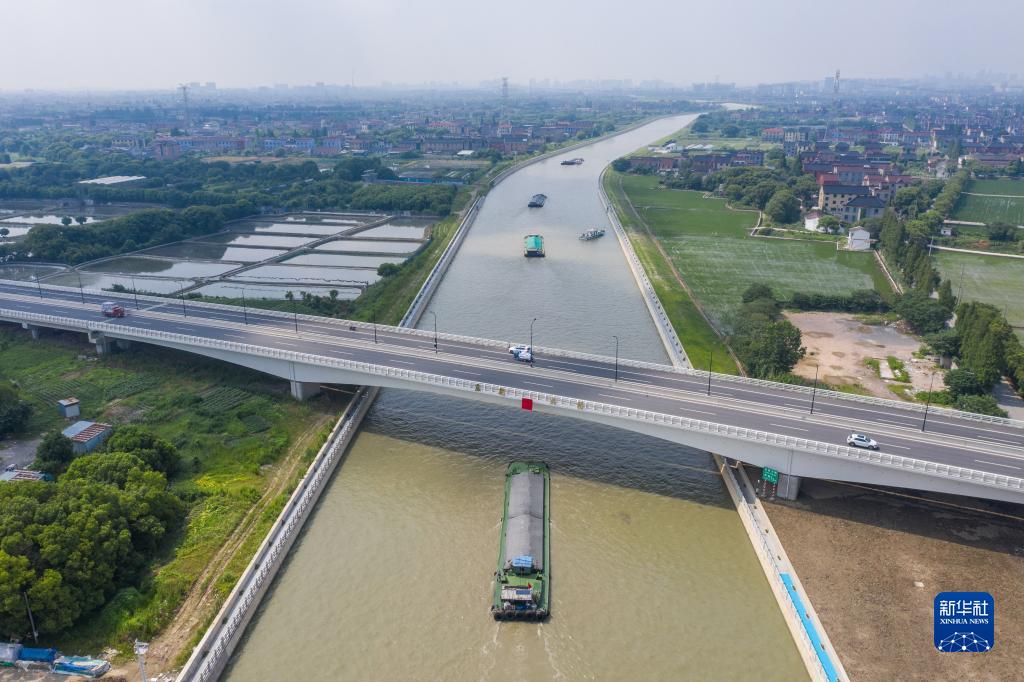 7月18日,首批通航貨船進入京杭運河杭州段二通道駛往錢塘江(無人機照片)。