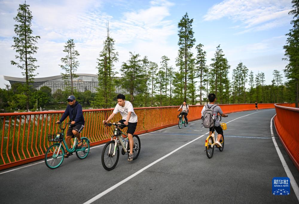 7月14日,體育愛好者在成都高新區錦城湖公園騎行。