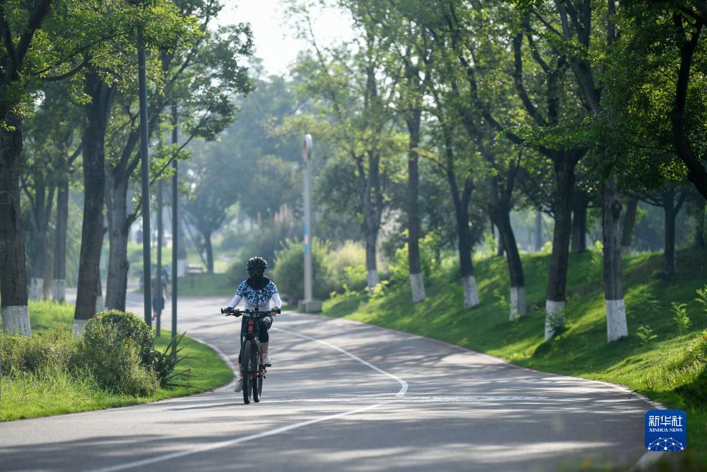 7月16日,市民在成都天府綠道騎行。