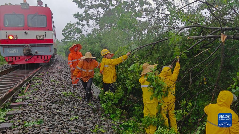 7月18日,國鐵南寧局沿海鐵路公司職工在清理被颱風吹倒的樹木。當日,國鐵南寧局沿海鐵路公司組織職工利用軌道車,在風雨中對西部陸海新通道鐵路沿線進行巡檢,對線路和防洪重點處所進行全面巡查,及時處理危竹危樹、接觸網設備隱患等問題,全力確保鐵路運行安全。