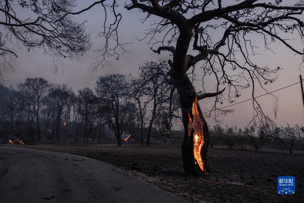 這是7月17日在希臘雅典郊外盧特拉基附近拍攝的燃燒着的樹木。