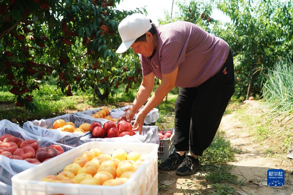 7月18日,在北京市平谷區大華山鎮的一處桃園,桃農整理採摘好的桃子。