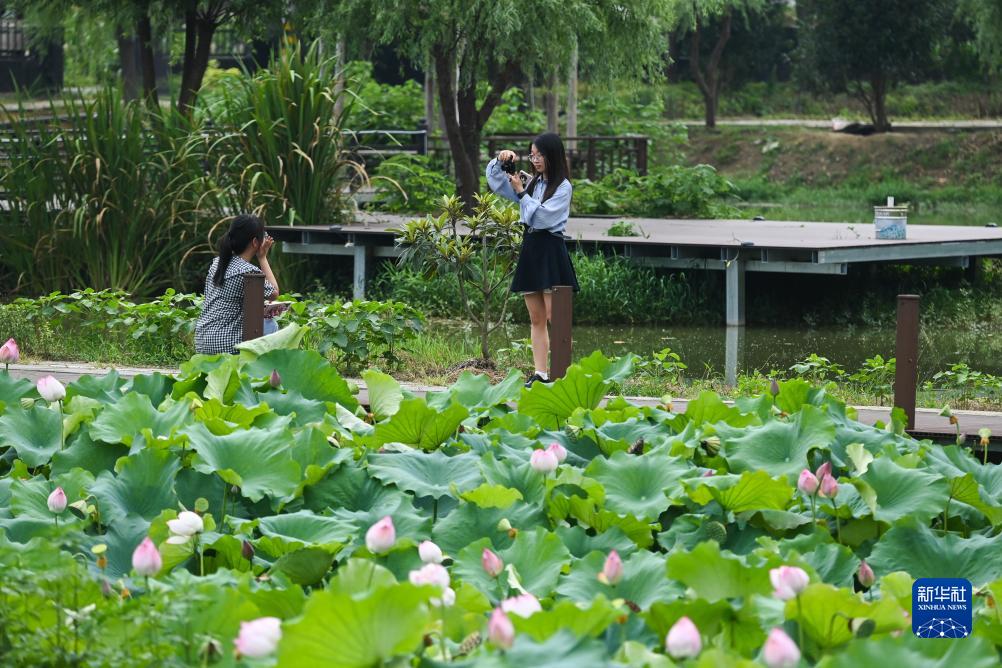 7月18日,游客在杭州富陽廣吉生態農業基地的荷花池邊拍照。位於杭州市富陽區銀湖街道坑西村的廣吉生態農業基地是由回歸的新鄉賢創辦,是一家集水産養殖、垂釣、餐飲、觀光於一體的農文旅休閒産業基地。