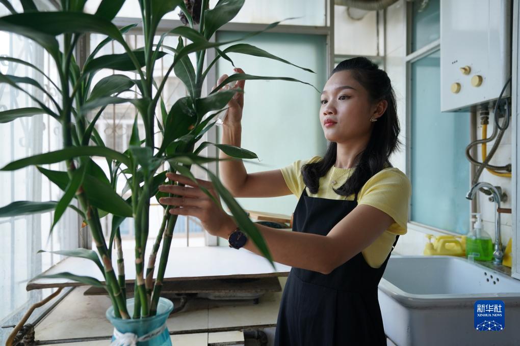 依波逢在位於昆明的住處打理綠植(7月15日攝)。