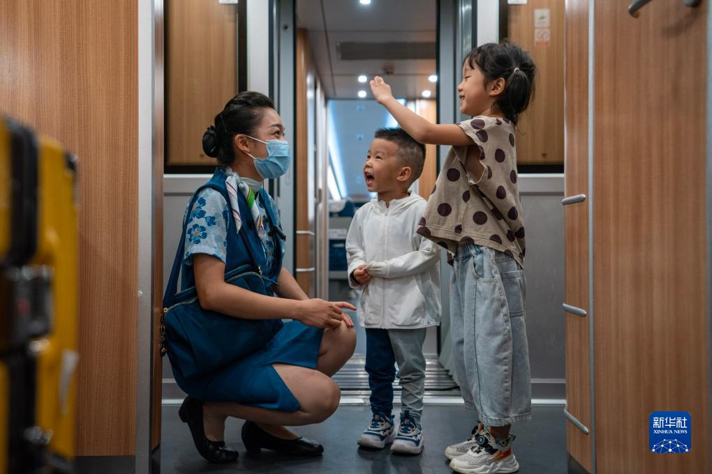 依波逢(左一)在D887次列車上與小朋友互動(7月16日攝)。