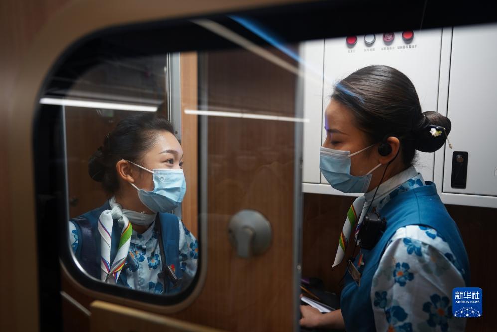 依波逢(左)在D887次列車上與同事交流工作(7月16日攝)。