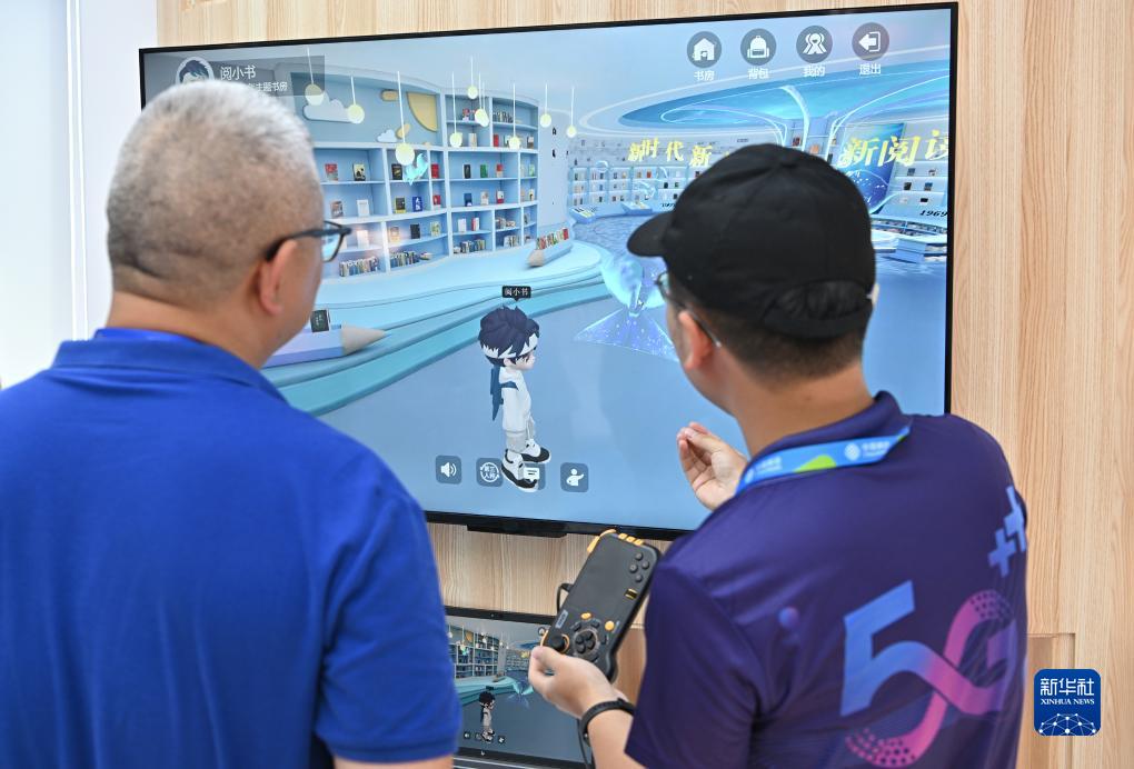 7月18日,與會者在大會設置的數字技術與應用成果展的中國移動展&了解“比特書房”元宇宙閱讀。