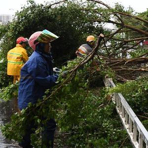 7月18日,在廣東湛江市海園路,市政人員在清理倒伏樹木。