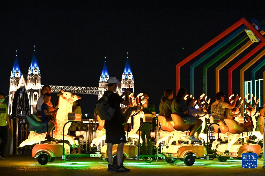 在新疆布爾津縣七彩河休閒旅游度假區,游客乘坐觀光車游覽(7月18日攝)。