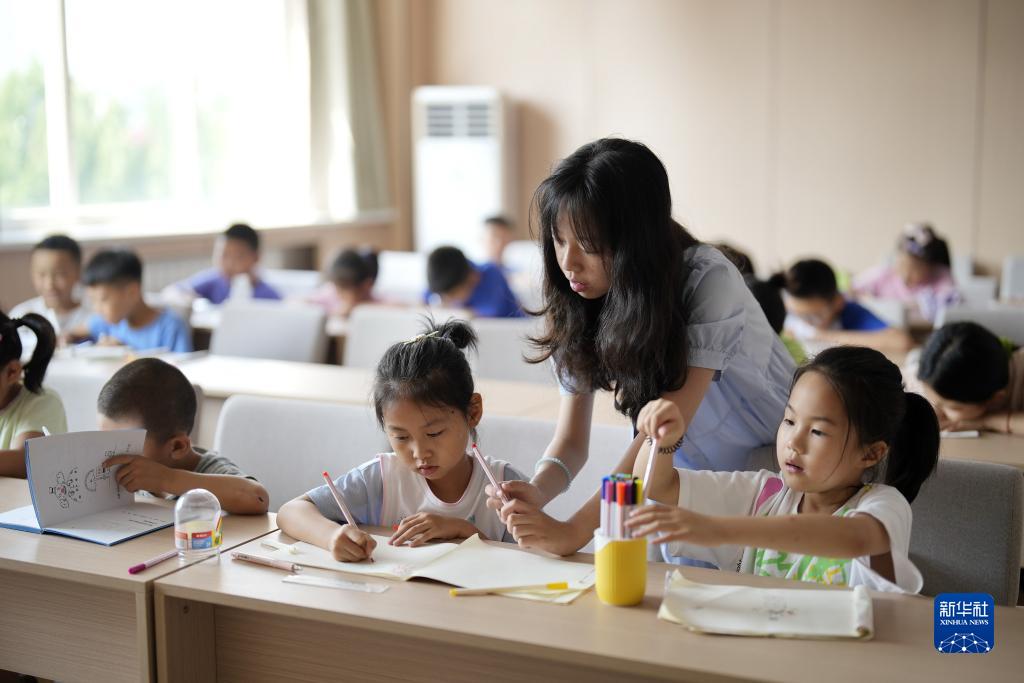 7月19日,孩子們在河北省唐山市豐南區新興社區開辦的“愛心暑托班”上學習繪畫。