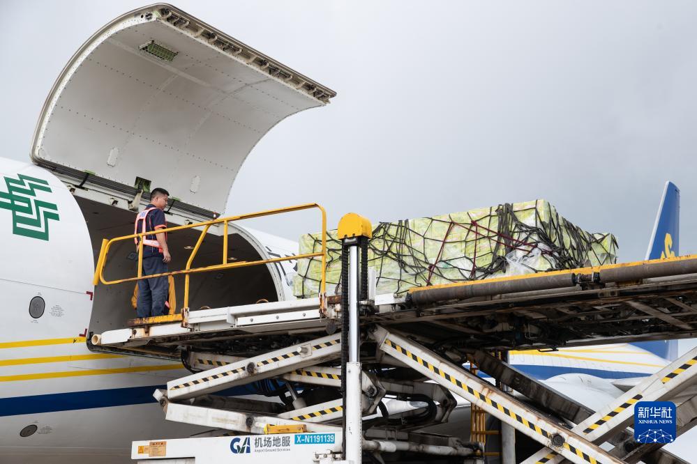 6月28日,在重慶巫山機場,機場工作人員將打包好的巫山脆李運送至中國郵政航空公司的全貨機。