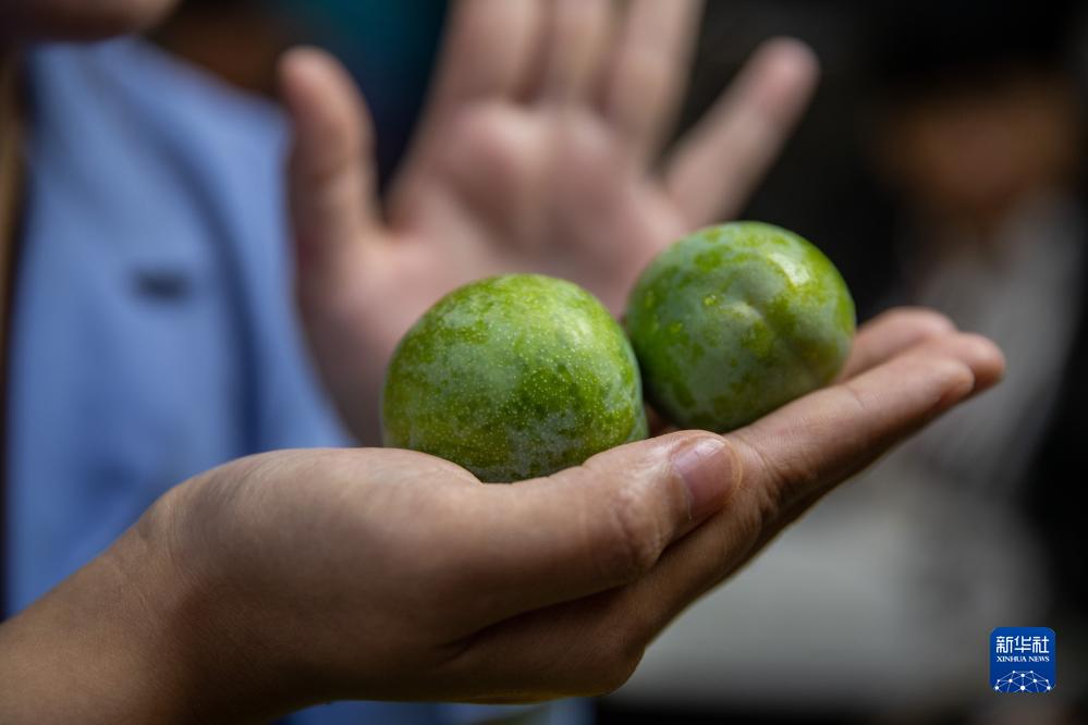 6月30日,在重慶市巫山縣曲尺鄉柑園村,主播劉嘉陵在網絡直播中展示並介紹巫山脆李。