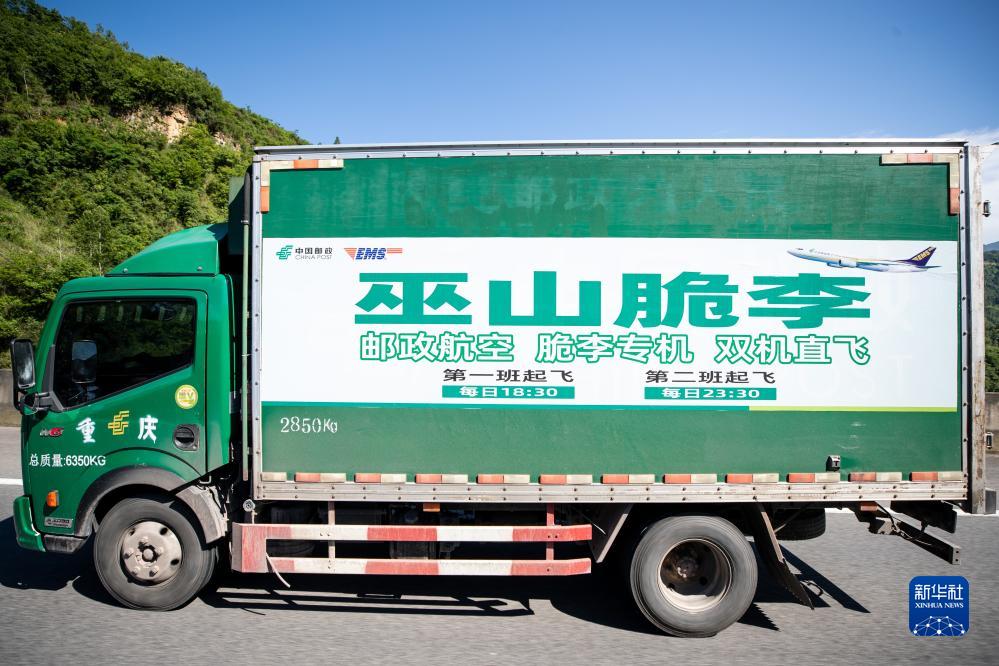 6月30日,在重慶市巫山縣,載着巫山脆李的中國郵政物流車行駛在高速公路上。