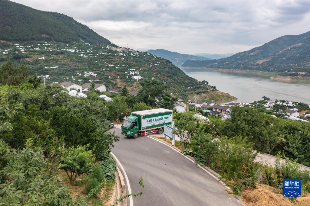 6月28日,在重慶市巫山縣曲尺鄉柑園村,裝載有巫山脆李的中國郵政物流車行駛在村內(無人機照片)。