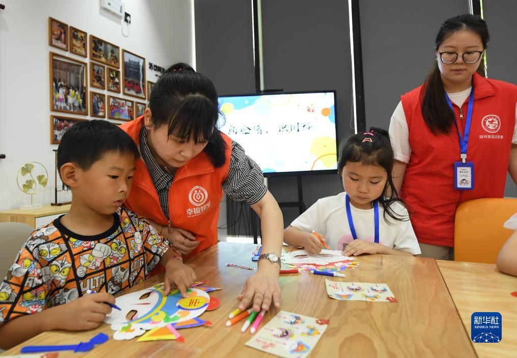 7月19日,在湖州市吳興區愛山街道,幸福鄰里志願者帶領孩子們做手工。