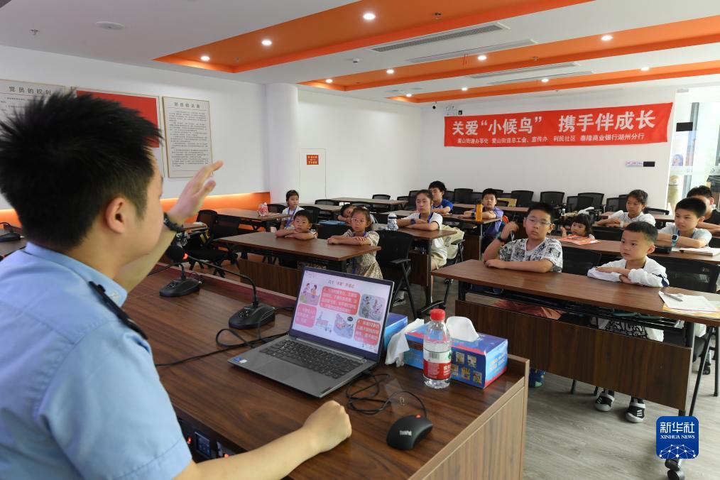 7月19日,在湖州市吳興區愛山街道,吳興區公安分局的民警給孩子們講授暑期安全防範知識。