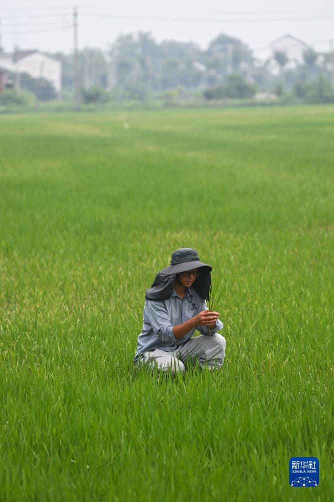 7月19日,在湖州市東林鎮保永村,種糧大戶查看水稻的長勢。