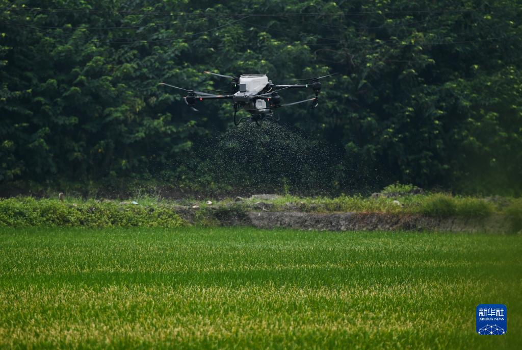 7月19日,在湖州市東林鎮保永村,種糧大戶操縱植保無人機為稻田施肥。