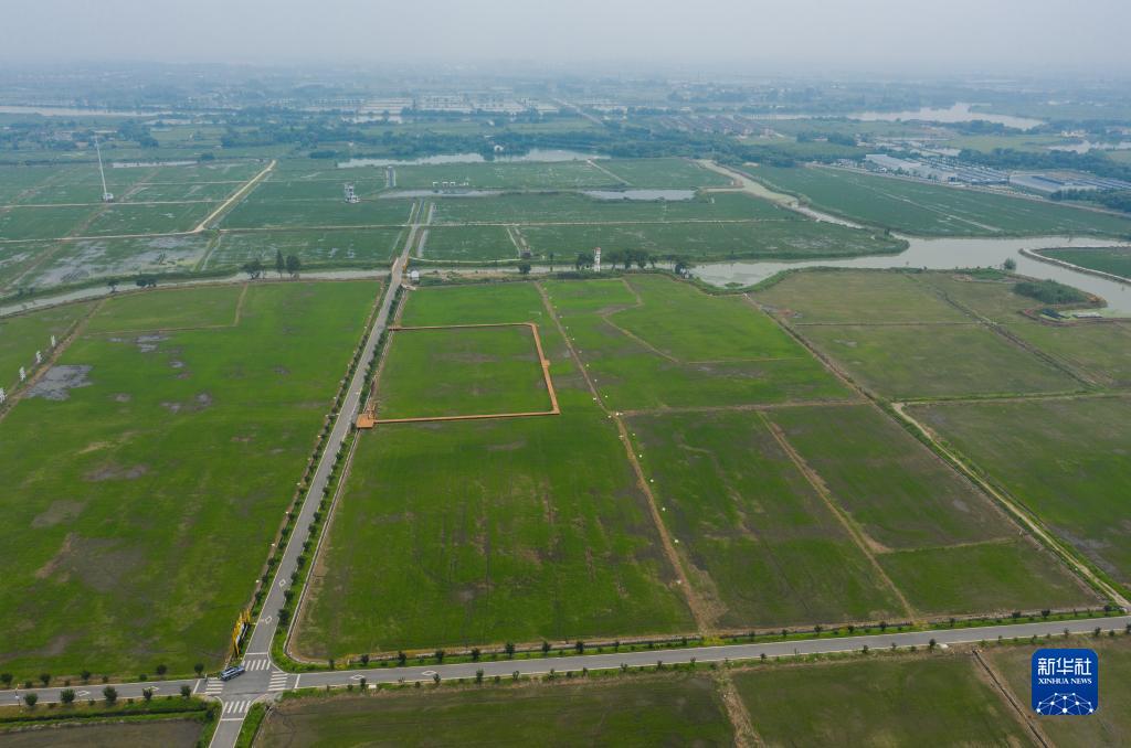 7月19日拍攝的湖州市東林鎮東華村經過萬畝方集中連片整治後的連片農田,田裏種植了水稻(無人機照片)。