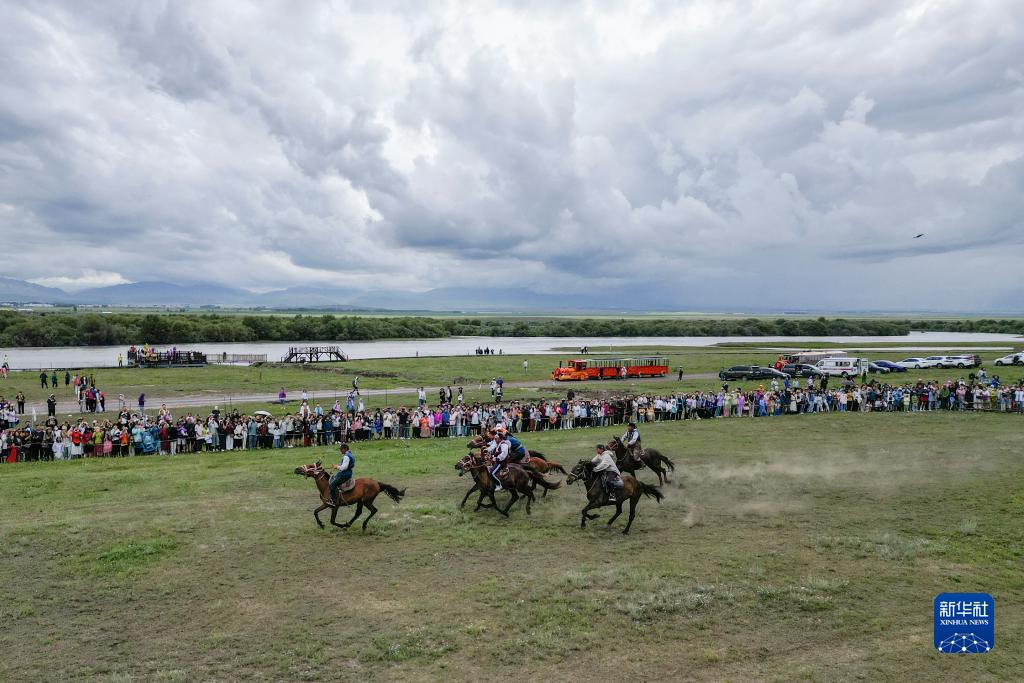 游客在新疆伊犁哈薩克自治州昭蘇縣濕地公園景區觀看民俗表演(7月17日攝,無人機照片)。