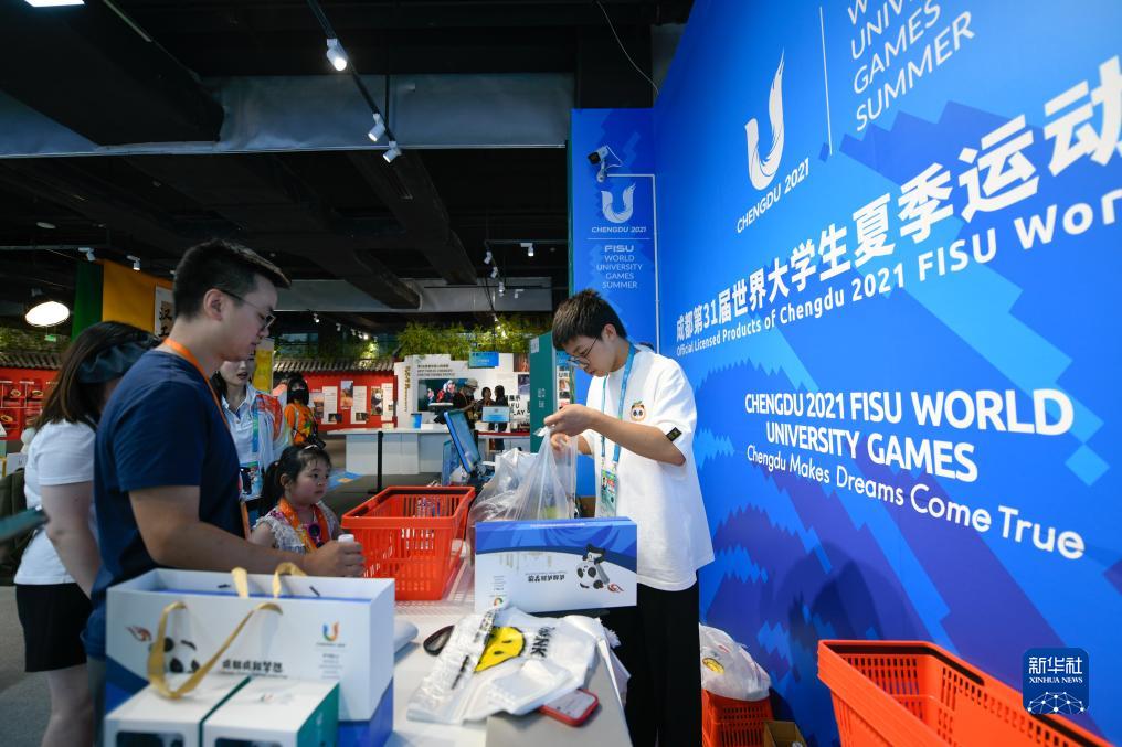 7月16日,市民在成都大運會大運村官方特許商品零售店內選購特許商品。