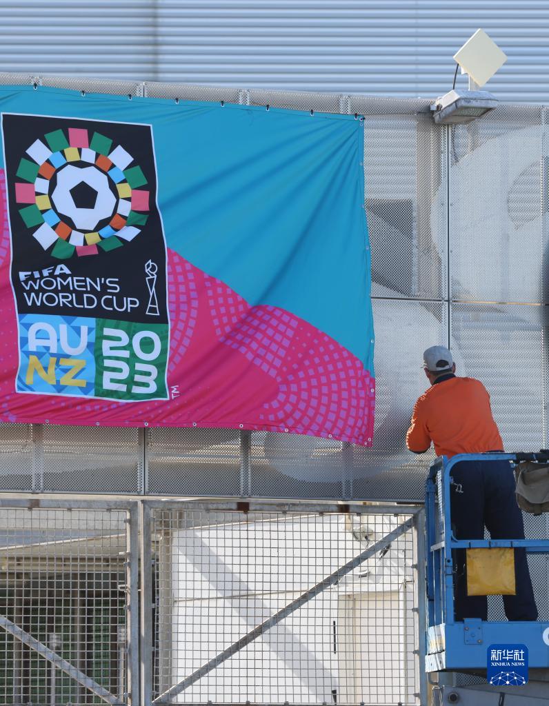 7月17日,在新西蘭首都惠靈頓,一名工人在張貼2023年國際足聯女足世界盃海報。